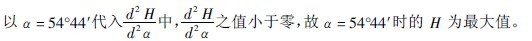在拋落式工作的磨機中,磨礦作用主要來自鋼球落下時的動能。此動能的大小,與鋼球的落下高度(H)有關,而鋼球的落下高度又決定于磨機的轉速。根據前面的論述,必然可從鋼球更大落下高度來決定磨機的合適轉速。照此理,將公式(2-29)取導數,并令它等于零,就可以求出使鋼球有拋物落下高度時的脫離角,再從它找到相應的轉速。