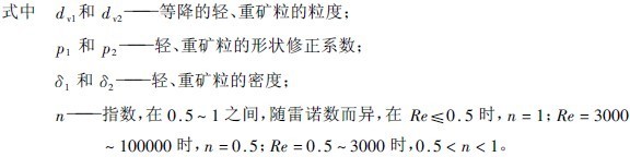 小密度顆粒的粒度與沉降末速度相等的大密度顆粒粒度之比值,稱為顆粒的等降比,其值大于1。可以根據沉降速度相等的關系求出。