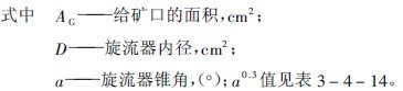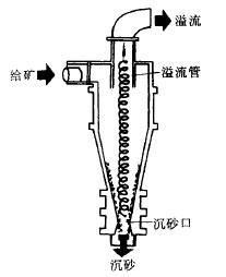旋流器的構造如圖3-4-17所示。主要由一個空心圓柱體和圓錐體連接而成。圓柱體的直徑代表旋流器的規格,由50~1000mm,常用者為125~500mm。在圓柱體中心插入一個溢流管,沿切線方向接有給礦管,在錐體下部留有沉砂(或稱底流)口。