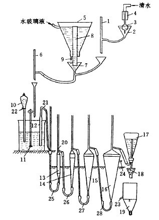 沉降法中比較簡單而又可靠的方法是淘析法,淘析法的基本原理是利用逐步縮短沉降時間的方法,由細至粗、逐步地將各粒級物料從試料中淘析出來。