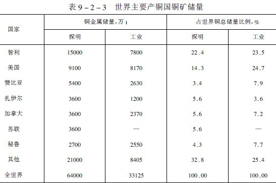 近年來,世界各地陸續發現和開發了一些新的礦床,擴大了一些老礦床和利用了一些低晶位銅礦,世界銅礦儲量有所增長。據美國礦山局1981年礦產要覽所載,世界已探明的銅金屬量為6.4億噸,其中正在開采的礦山儲量為3億噸,正在建設的礦山儲量為5850萬噸。銅礦主要集中在智利、美國、贊比亞、蘇聯和秘魯等國。智利、美國和贊比亞三國銅儲量約占世界總儲量的一半。世界銅礦儲量列于表9-2-3。