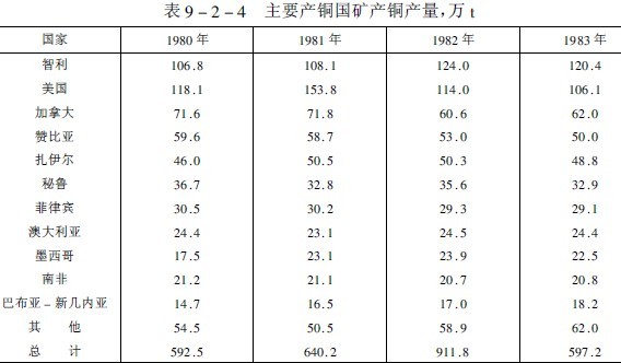 目前世界上采銅國家已有57個,但資本主義世界主要礦產銅生產國約11個(表9-2-4),其中美國、智利、加拿大和贊比亞為四個較大產銅國,約占資本主義世界礦產銅總產量的60%左右。除上述四國外,再加扎伊爾、秘魯、菲律賓和澳大利亞,約占資本主義世界礦產銅總量的83%。