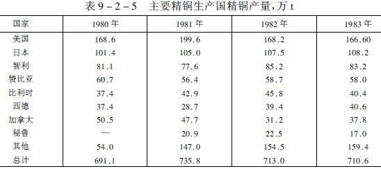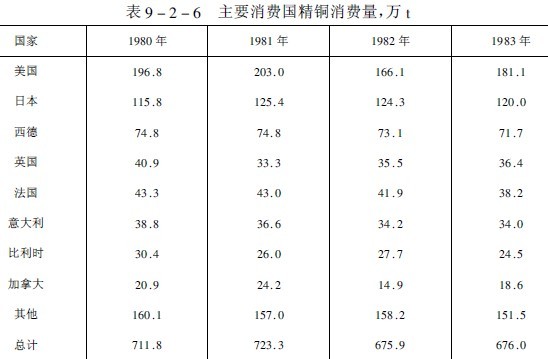 1983年,資本主義各國精銅消費量達680萬噸左右,與1982年的消費量相當(表9-2-6),其中美國增長15萬噸(9%),英國增長0.9萬噸(2.5%);加拿大增長3.7萬噸(25%)。其他各主要發達國家精銅的消費量普遍下降。