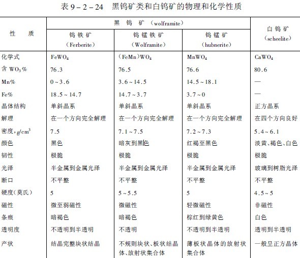白鎢礦(CaWO sub 4 /sub )是鈣鎢酸鹽,結(jié)晶呈正方晶系,鉬可能取代白鎢礦中的鎢,而形成一種類質(zhì)同象的鉬酸鈣(CaMoO sub 4 /sub )礦。白鎢礦在紫外線輻射感應(yīng)下,發(fā)出鮮明的藍(lán)白色熒光,當(dāng)?shù)V物中有鉬存在時(shí),會(huì)改變熒光的顏色,隨著鉬的含量增加,逐漸由藍(lán)色變?yōu)槊咨S色或橙色。表9-2-24是黑鎢礦類和白鎢礦的物理和化學(xué)性質(zhì)。