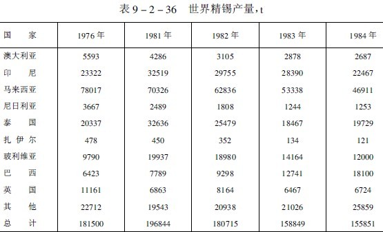 1976年以來,世界錫精礦含錫和精錫的產量列于表9-2-35和表9-2-36(不包括我國、蘇聯和東歐各國)