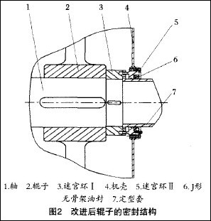 為了解決上述問題,對該密封結構進行改進,采用迷宮密封及J形無骨架油封結構,其結構見圖2。迷宮環I通過鍵聯接安裝在輥子軸上,迷宮環Ⅱ安裝在機殼上,這樣迷宮環I和迷官環Ⅱ組成了一組迷宮密封。在迷宮環的外側還安裝了l副J形無骨架油封。